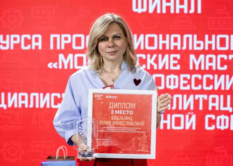 Специалист по социальной реабилитации нашего Геронтологического центра Бабальянц Юлия Вячеславовна приняла участие в конкурсе профессионального мастерства «Московские мастера» по профессии «Специалист по реабилитационной работе в социальной сфере».