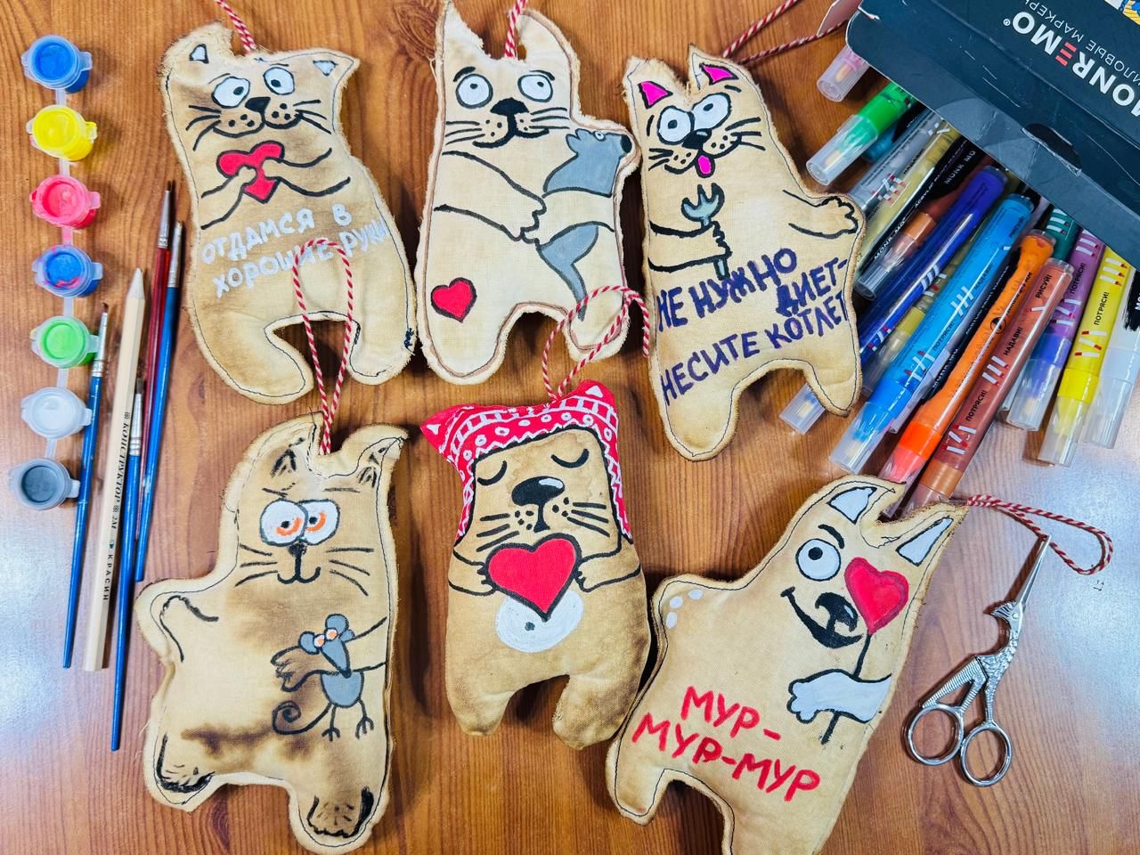 В первый день мы их сшивали, наполнили синтепоном, затем погрузили в грунтовку из кофе, корицы и ванили. Этот секретный ингредиент придал им неповторимый кофейный оттенок и восхитительный аромат, который наполняет пространство уютом. После сушки мы раскрасили котиков акрилом, оживив их, добавив индивидуальности и характера.