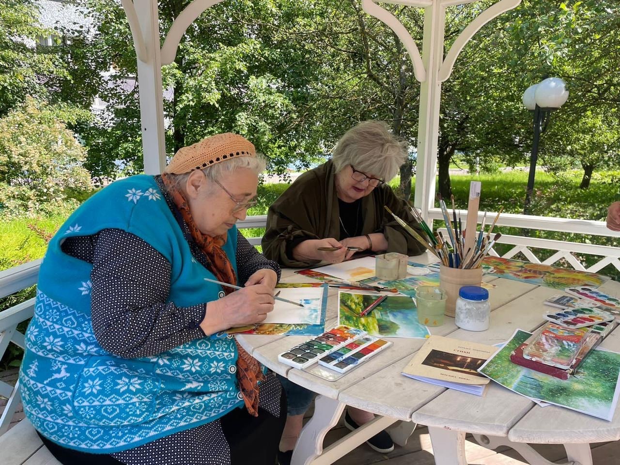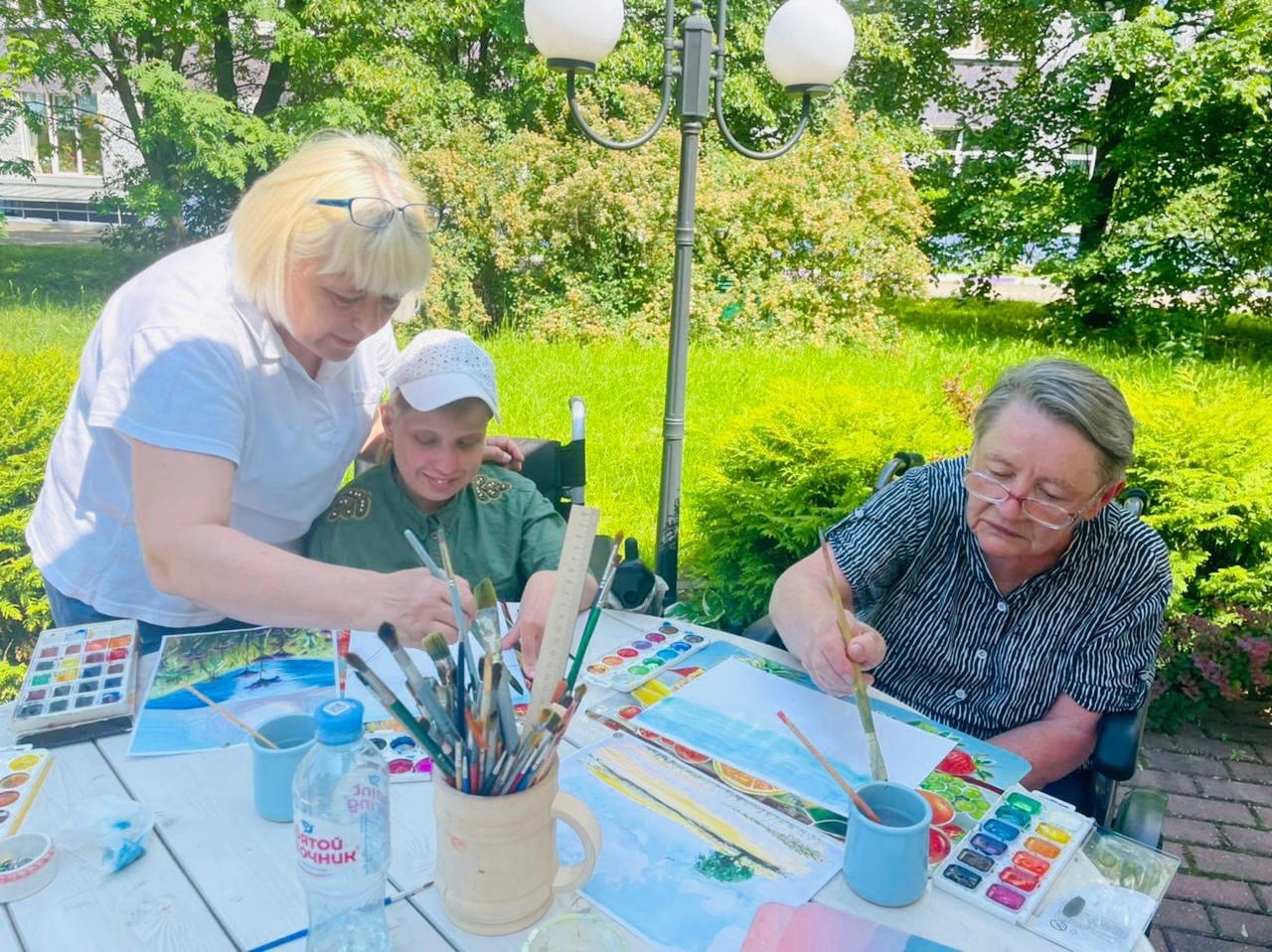 Лето, солнце, акварель! Что может быть чудеснее любимого хобби, к тому же на свежем воздухе? Подобный подход к творчеству дает колоссальный прорыв нашим навыкам не только с технической точки зрения. Когда мы рисуем, мы задействуем все органы чувств — слышим, чувствуем кожей и ощущаем запахи природы, становясь к ней ближе. На протяжении нескольких занятий наши проживающие вместе со специалистом по социальной реабилитации Ивашкевич Ириной Николаевной рисовали летние пейзажи и одновременно перечитывали произведения поэтов «Серебряного века». «Такие занятия оставляют в моей душе ощущения счастья и умиротворения», - поделилась с нами своими впечатлениями о занятии Осепчук Елена Олеговна.